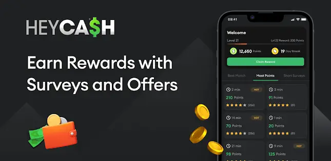 HeyCash also highlights additional earning methods like games and offerwalls, which can pay differently than surveys.